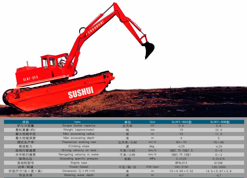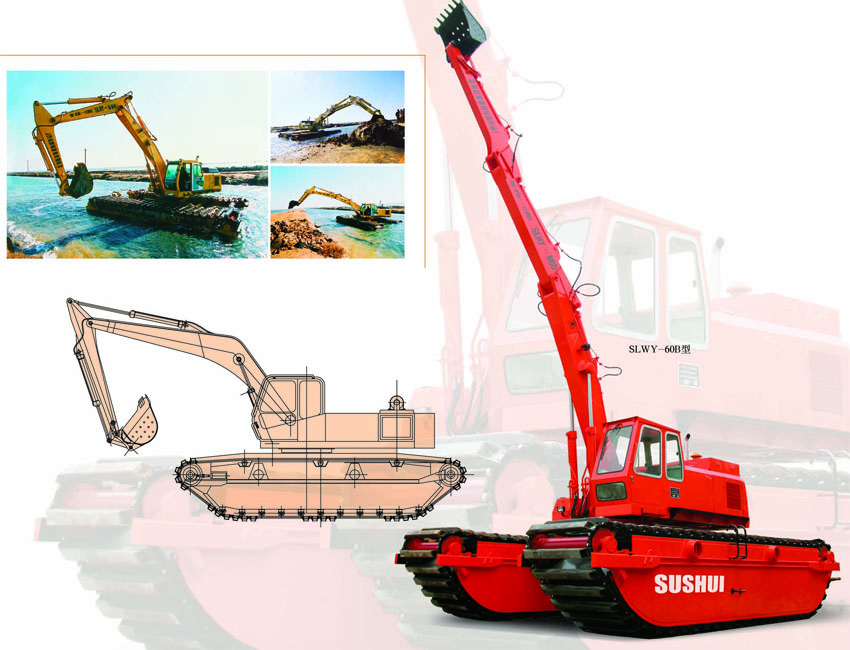SLWY60型水陸兩用全液壓單斗履帶式挖掘機系我公司制造的清淤機系列產品,經過部級鑒定,該機性能先進、機動靈活、工作效率高,并能自行出入水域、上下河坡,可在陸地、水中、淤泥地、輕沼澤地和雜草地帶施工作業。